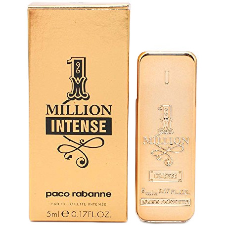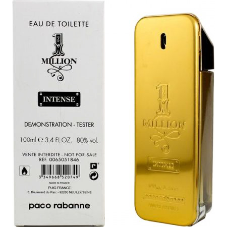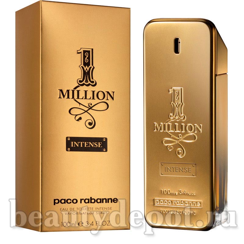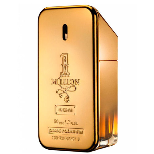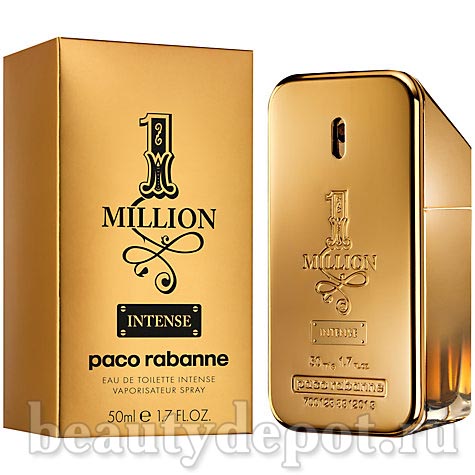 Paco Rabanne 1 Million Intense (Пако РАбанне 1 Миллион Интенс). Оформление парфюма, в виде слитка золота, осталось неизменным, а вот нотная пирамида аромата претерпела значительные изменения. Интенсивная версия аромата 1 Million стала менее сладкой. В этой версии аромата выделены котрапунктом кожаные, древесные и пряные ноты, что придает букету еще большую сбалансированность и утончённость. Верхние ноты начинаются с цитрусового звучания мандарина, пряного кардамона, черного перца и шафрана. Затем композиция плавно переходит в сердечные ноты, где нас сразу встречает необычная для мужского аромата нота розы, причем в концентрации абсолю, в сочетании с корицей и нероли (цветок апельсинового дерева). В базе аромат оставляет за собой долгое шлейфовое звучание мужских нот из белой кожи, шипровой пачули, пудрового ириса и соблазнительного сандала.