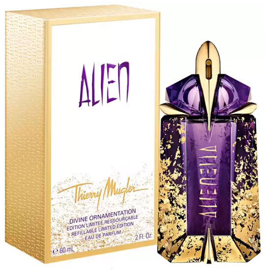 В лимитированном издании Alien Divine Ornamentation флакон покрывается золотой патиной. Изысканный орнамент, выполненный из золота 708 и 750 пробы, делает аметистовый талисман Alien еще более желанным и драгоценным. Классический аромат Парфюмерной воды остается неизменным: солнечные ноты жасмина самбак переливаются бархатистым амбровым шлейфом. Теплый и чувственный, Alien раскрывает сияние и великолепие каждой женщины. Чтобы сохранить коллекционный флакон, вы сможете заполнять его любимым ароматом снова и снова.
