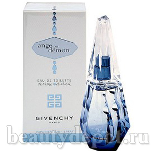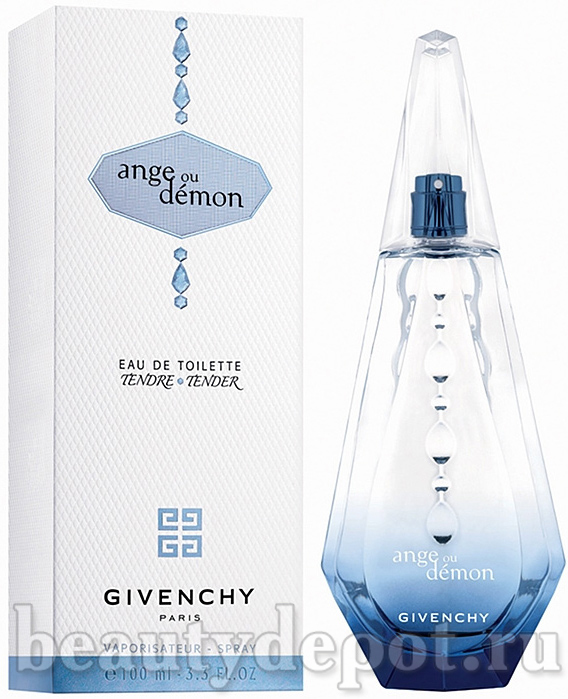 Givenchy Ange ou Demon Tender (Живанши Ангел и Демон Тендр) - интерпретация аромата Ange ou Demon предстает более мягкой и нежной версией, становясь гармоничным дуэтом двух противоположностей: "света и тени", "дня и ночи", "темного и светлого". И в этом дуэте новый аромат Ange ou Demon Tendre скорее “Ангел", чем "Демон". Так Givenchy обращается к двум разным сущностям, живущим в одной женщине. Образ Ангела”соткан из прозрачного тонкого кружева: "невинность" предстает белым цветочным букетом из лесных ландышей, майских пионов, лилий и флердоранжа, "чистота и наивность" - Калабрийским мандарином и гелиотропом, "теплота и нежность" - мягкими пачулями и палисандром. Изящный флакон-призма выполнен в виде застывшего кристалла водяной капли.
