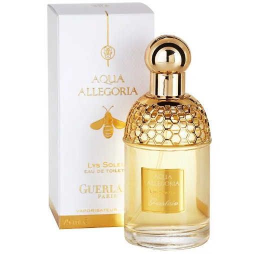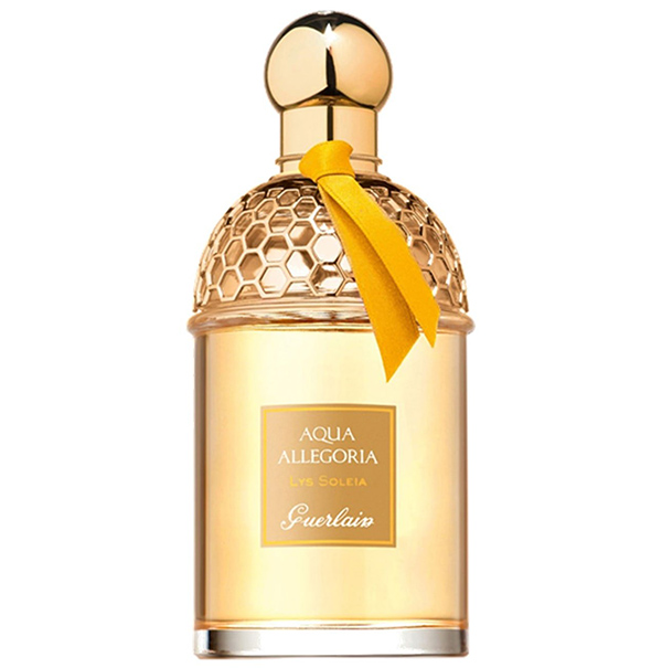 Guerlain Aqua Allegoria Lys Soleia (Герлен Аква Аллегория Лис Солеа). Guerlain нарисовал картину распускающегося весеннего сада с первыми набухающими почками на деревьях, сочной зелёной травой и трепетными цветами, покрытыми каплями росы. Центральное место в композиции отведено двум солнечным нотам: восточной жёлтой лилии и королевской белой лилии. Название аромата в переводе на русский звучит, как «Солнечная лилия». Цитрусовые и тропические нотки делают звучание более насыщенным, придавая ему сочные сладковатые оттенки.