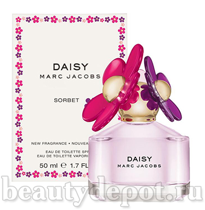 Marc Jacobs Daisy Sorbet. Цветочный фруктовый букет стартует волшебными переливами прохладной утонченной груши, изысканно-горького розового грейпфрута и аппетитными вкраплениями спелой маракуйи. В сердце Daisy Sorbet разливаются обворожительные переливы нежной глицинии, трепетного ландыша и терпковатого жасмина. Им вторят роскошные, слегка пряные ноты бархатной фиалки. База композиции представлена сливочно-хвойной древесиной кедра и невесомым мускусом. Гурманский и вдохновляющий аромат для элегантных женщин.
