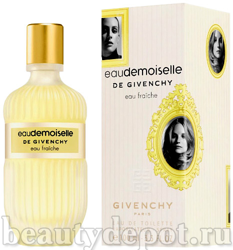 Givenchy Eaudemoiselle de Givenchy Eau Fraiche (Живанши Эодемозель от Живанши Ау Фреш). Более свежая вариация начального аромата Eaudemoiselle. Аромат символизирует естественную элегантность и черпает вдохновение из прекрасных ароматов весеннего воздуха, свежих цитрусовых и зеленых лугов. Парфюмерная композиция открывается взрывом цитрусовых - мандарина, бергамота, птитгрейна и лимона. В цветочном сердце Eaudemoiselle de Givenchy Eau Fraiche расцветает турецкая роза, цветы апельсина, фиалки и ревень, переходя в чувственно-теплую мускусную базу.