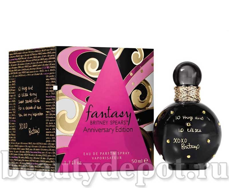 Britney Spears Fantasy Anniversary Edition - яркий, интригующий и очаровательный аромат. Fantasy Anniversary Edition дань уважения поклонникам певицы Britney Spears в новой особой упаковке. Композиция облачена в чёрный непрозрачный флакон-шар, который украшен золотистыми кристаллами и золотым декором на горлышке. На флаконе и коробке написаны имена самых преданных поклонников Бритни со всего мира. Внешняя коробка выпущена в трех вариантах - с тремя разными посланиями для фанатов: "10 объятий и 10 поцелуев", "Моим сладко благоухающим поклонникам в честь 10-летия любви" и "Вы мое вдохновение" XOXO Britney.
