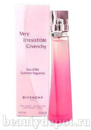 Givenchy Very Irresistible Eau d'Ete Summer Fragrance (Живанши Вери Иррисистбл Эу Де Эте Саммер Фрагранс) - летняя интерпретация аромата Very Irresistible, выпущенная ограниченной серией. Very Irresistible Eau D'Ete Summer Fragrance, подобно нежной вуали окутает кожу ароматной пеленой, сотканной из нот мандарина, прекрасных роз, пиона, звездчатого аниса, листьев вербены. Удлиненный закрученный флакон из розового матового стекла венчает прозрачная крышечка с серебряным ободком.