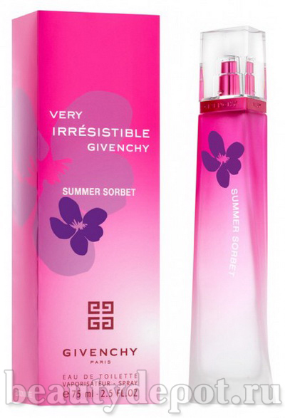 Givenchy Very Irresistible Summer Sorbet (Живанши Вери Ирресистбл Саммер Сорбет) - летняя версия аромата Givenchy Very Irresistible. Подобно ледяному сорбету, это свежий радостный аромат. Основной ингредиент в аромате - фиалка. Довольно необычный выбор - в Givenchy знают, что сладкие фруктовые ароматы, традиционно считающиеся летними, - это предсказуемо, взамен предлагая свежесть листьев и пикантность замороженных ягод. В сердце у Summer Sorbet – дуэт черники и клюквы, а индивидуальное зеленое звучание в них и привносят вышеупомянутые ингредиенты. Very Irresistible Summer Sorbet - это букет из роз и звездчатого аниса, раскрывающийся аккордом черники и клюквы. В шлейфе - легкая зеленая нота фиалки и древесные ноты.
